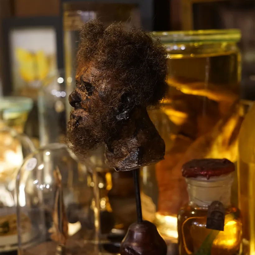Reproduction de « Tête réduite » très réaliste avec de vrais cheveux sur socle avec ou sans globe. La plupart des objets de cette rubrique vont être sur commande avec un délai supérieur : entre 3 et 4 semaines environ. merci de votre patience…